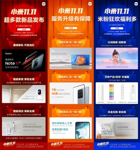 同时,小米11.11期间除了小米手机、电视、智能生态会有超多款新品发布以及大额补贴福利外,新品预售期每天还会抽送定制品,11月1日正式开启后还有万件好物限时一折秒、整点抢最高1111元红包等重磅惊喜。除此之外,小米服务也全面升级:现货订单下单后48小时内发货、购买手机售后无忧,7天无忧退换、30天质量问题焕新,电视产品送装服务一体“一次上门,一次解决”... ...