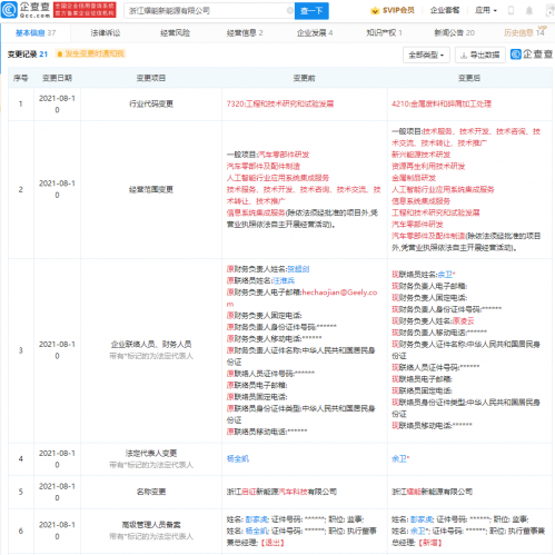 【TechWeb】企查查APP显示,8月10日,原浙江启征新能源汽车科技有限公司发生工商变更,公司更名为浙江耀能新能源有限公司,行业代码由工程和技术研究和试验发展变更为金属废料和碎屑加工处理,法定代表人由杨全凯变更为余卫,经营范围新增新兴能源技术研发;资源再生利用技术研发;金属制品研发;工程和技术研究和试验发展。