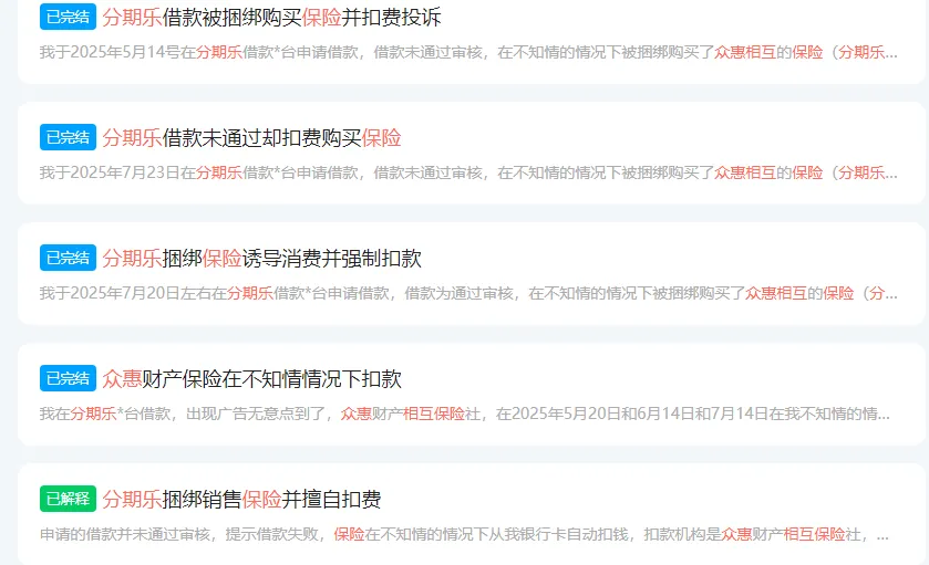 这些投诉都有一个基本相同的情节——用户在完成借款操作后,除了偿还本金和利息,还会被扣除一笔名目为“保费”的款项,扣款方正是众惠相互保险。这种扣费通常没有显著提示,也未经过用户明确、单独的授权确认,悄然成为借款成本的一部分。