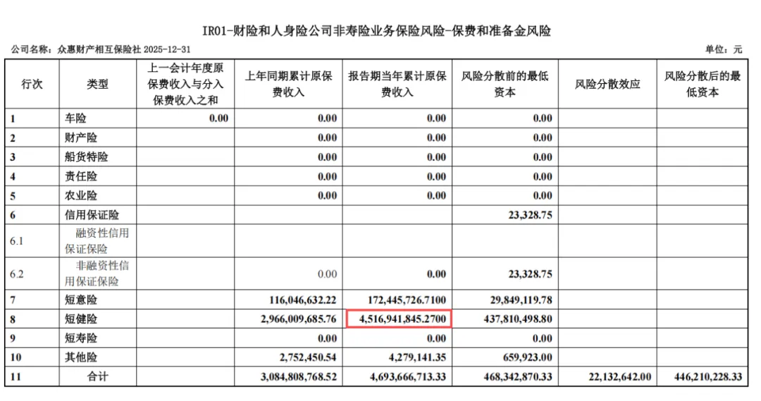 2025年第四季度偿付能力报告显示,众惠相互保险去年的原保费收入为46.94亿元,其中短期健康险的原保费收入为45.17亿元,占总保费收入的96.23%;短期意外险的原保费收入为1.72亿元,其他险种的保费收入合计为427.91万元。信用保证险的保费收入为0元。