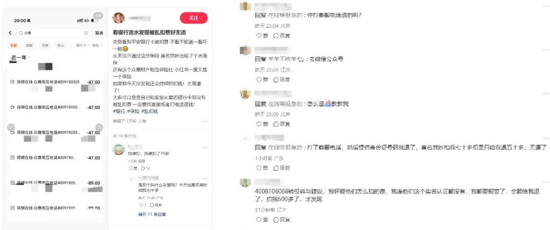 该条笔记评论区,也有不少用户分享自己被扣费及追回扣款的经历,一用户称自己只是打了客服电话并提供身份证号码就退了,但当初扣款扣了七十多元,退款只退了五十多元。另一名用户表示自己连众惠相互保险的实名认证都没有就被扣费,最后退了600多元。