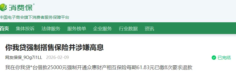消费保平台的投诉则更为具体,并且还牵扯出一些助贷平台。如2月9日一名用户投诉称,自己在你我贷平台借款2.5万元,但被强制开通了众惠财产相互保险,每期需缴纳61.83元,目前已经缴纳8次,要求平台退款。