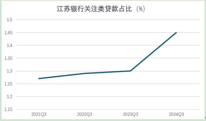 相比之下,江苏银行的关注类贷款占比却出现明显上升。截至9月末,该行关注类贷款余额约为303.62亿元,占比为1.45%。这一比例较2023年9月末的1.3%,上升0.15个百分点;较2023年末的1.32%,上升0.13个百分点。