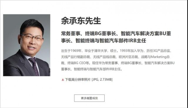 目前,余承东在华为的职务为:华为终端BG CEO、智能汽车解决方案BU董事长、智能终端与智能汽车部件IRB主任。