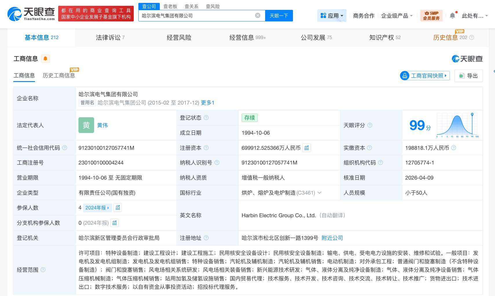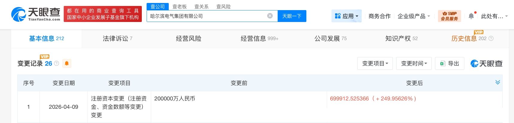 天眼查工商信息显示,近日,哈尔滨电气集团有限公司发生工商变更,注册资本由20亿人民币增至约70亿人民币,增幅约250%。