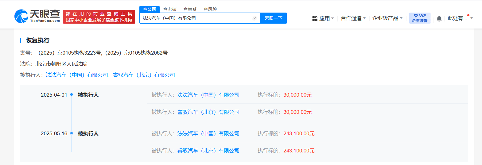 近日,法法汽车(中国)有限公司及其子公司睿驭汽车(北京)有限公司新增一则恢复执行信息,执行标的24.31万元,执行法院为北京市朝阳区人民法院。