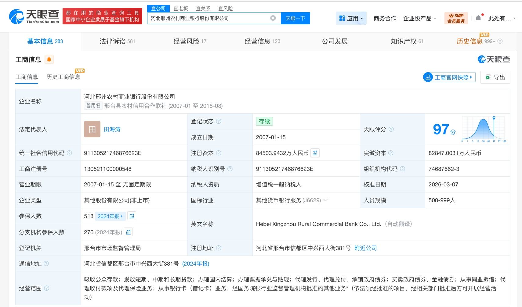 该公司成立于2007年1月,法定代表人为田海涛,经营范围包括吸收公众存款,发放短期、中期和长期贷款,办理国内结算,办理票据承兑与贴现等。股东信息显示,该公司由邢台市德源房地产开发有限公司、邢台未来商贸有限公司、沙河市海生玻璃有限公司、邢台旺鑫工贸有限公司等共同持股。