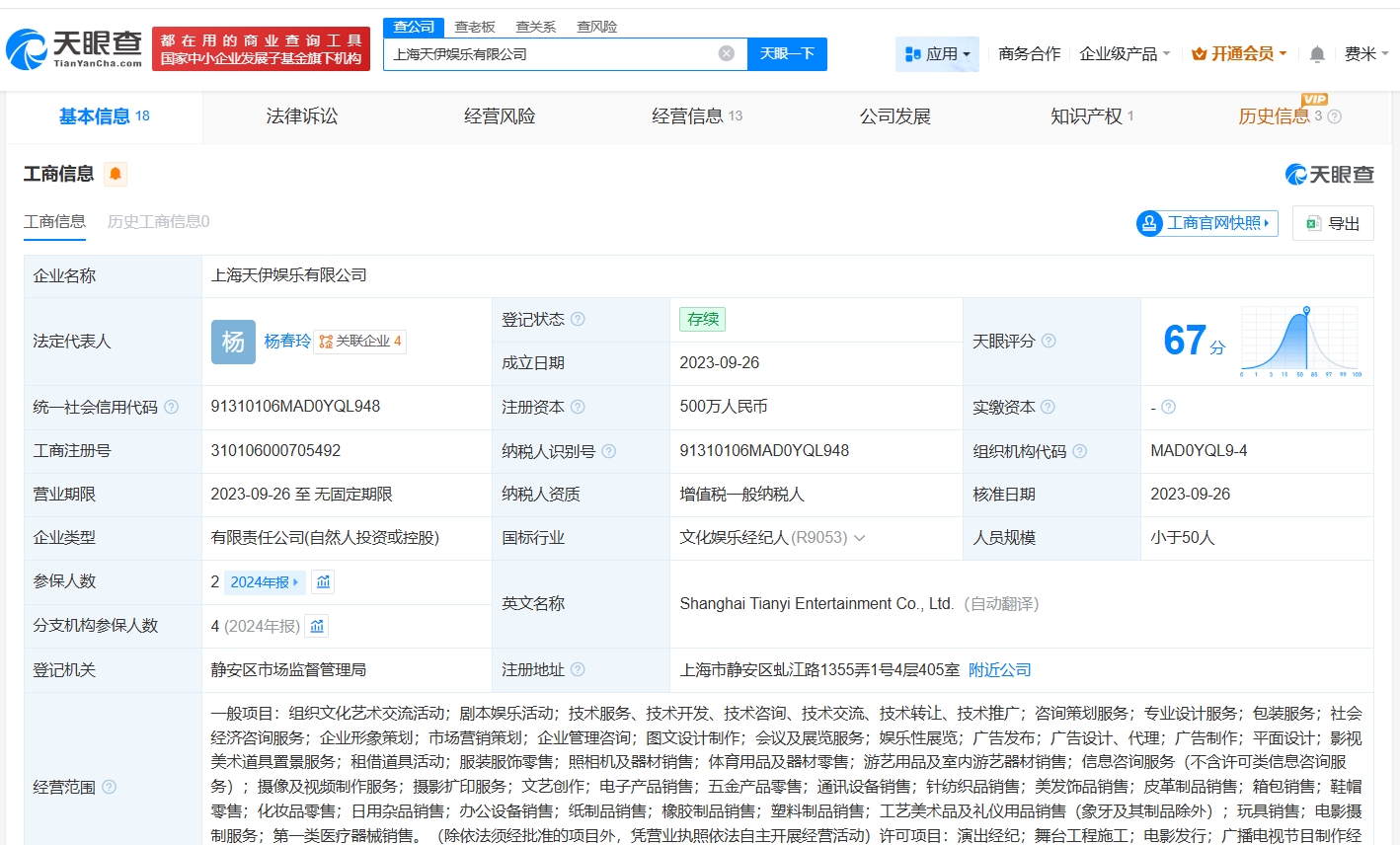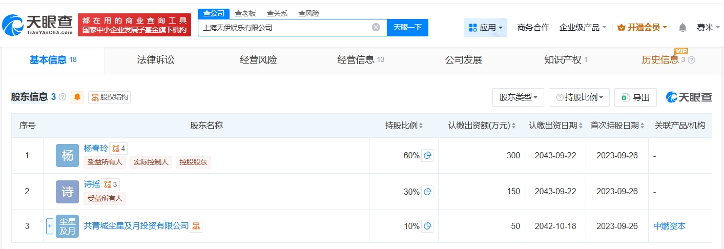 天眼查App显示,上海天伊娱乐有限公司成立于2023年9月,法定代表人为杨春玲,注册资本500万人民币,经营范围包括组织文化艺术交流活动、剧本娱乐活动、咨询策划服务等,由杨春玲、诗摇、共青城尘星及月投资有限公司共同持股。