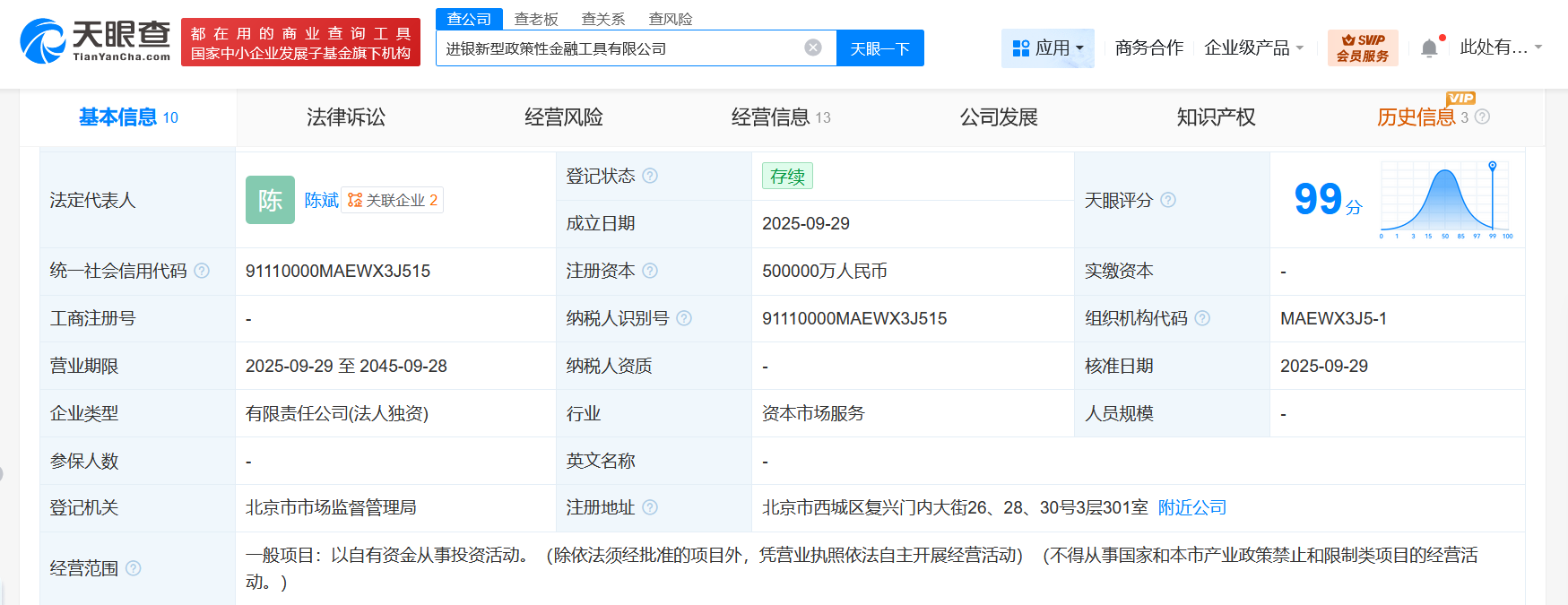 天眼查App显示,近日,国开新型政策性金融工具有限公司、农发新型政策性金融工具有限公司、进银新型政策性金融工具有限公司成立,法定代表人分别为陈梦蒙、张连钢、陈斌、注册资本分别为200亿人民币、100亿人民币、50亿人民币,经营范围均为以自有资金从事投资活动。