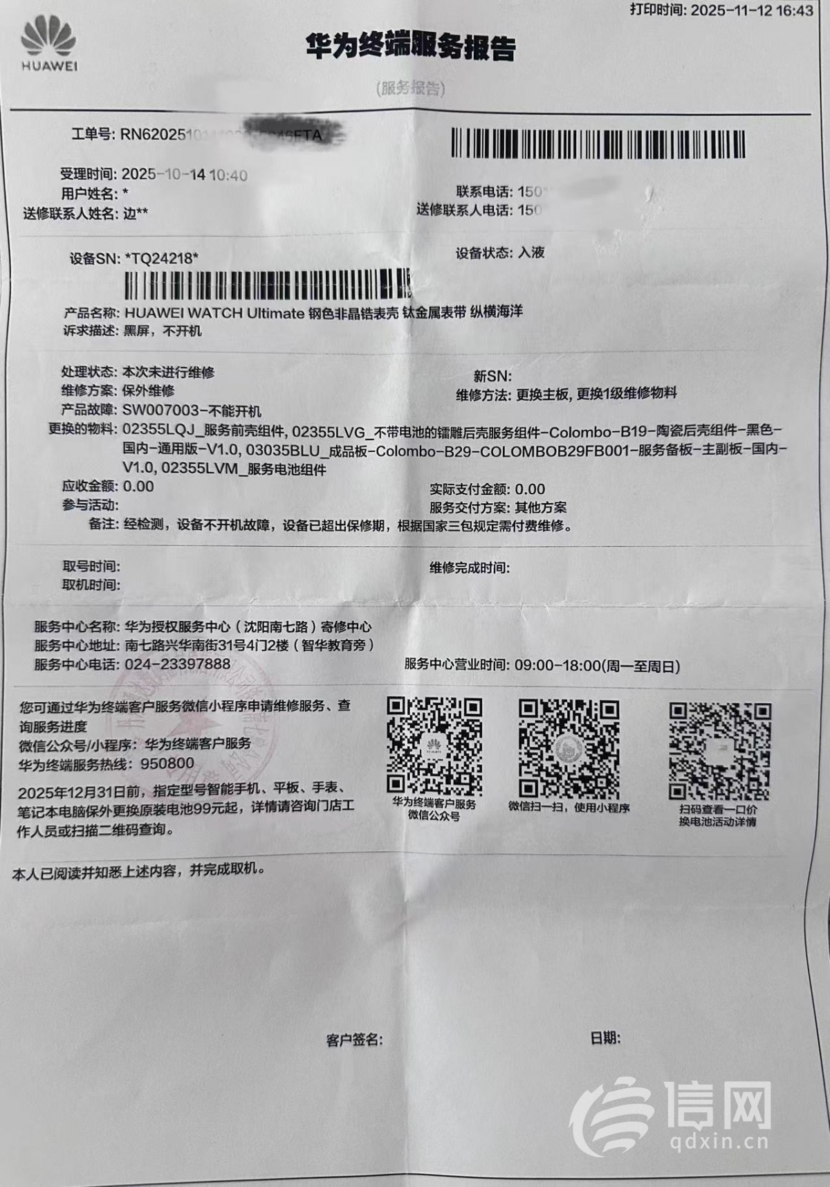 信号新闻致电华为客服询问此事。客服称,已有同事跟进,将催促其尽快联系用户核实具体情况。对于消费者“免费维修或换新”的诉求,客服表示需与用户本人沟通核实后,才能进一步处理,暂无法承诺处理结果与答复时间。