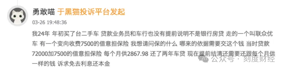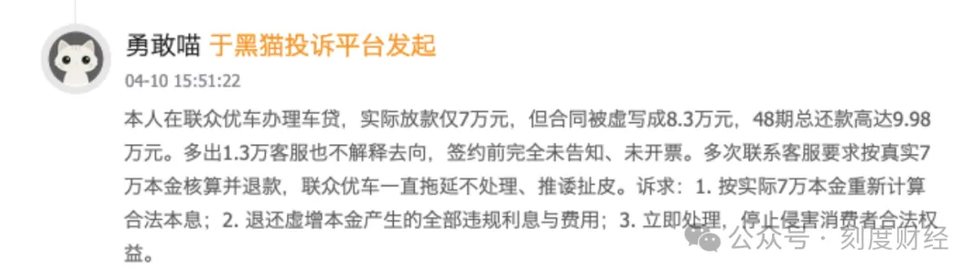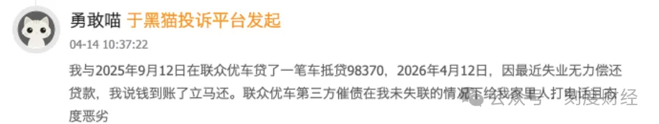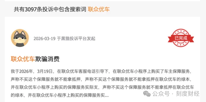 联众优车以融资租赁(售后回租)名义包装二手车贷产品,实则先将车辆过户至公司名下,再以租赁形式交由用户使用,并在此模式下通过阴阳合同、虚增本金、隐形收费、强制捆绑、扣押绿本、暴力催收等手段,持续收割消费者。截至4月20日,黑猫投诉平台累计投诉已超3000条。