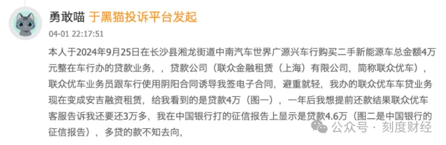 有用户表示,“联众优车业务员跟车行使用阴阳合同诱导我签电子合同,避重就轻,我办的联众优车车贷业务现在变成安吉融资租赁,给我看到的是贷款4万,一年后我想提前还款结果联众优车客服告诉我还要还3万多,我在中国银行打的征信报告上显示是贷款4.6万,多贷的款不知去向。”