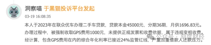 另一用户贷款45000元分36期,月供1696.83元,叠加1000元GPS费后,综合年化接近24%的监管红线。