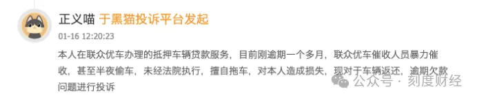 有用户表示,在联众优车办理的抵押车辆贷款服务,刚逾期一个多月,联众优车催收人员暴力催收,甚至半夜偷车,未经法院执行,擅自拖车。
