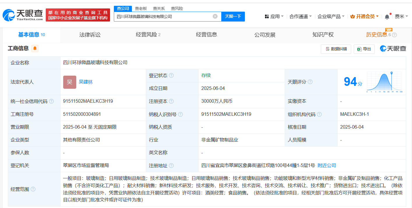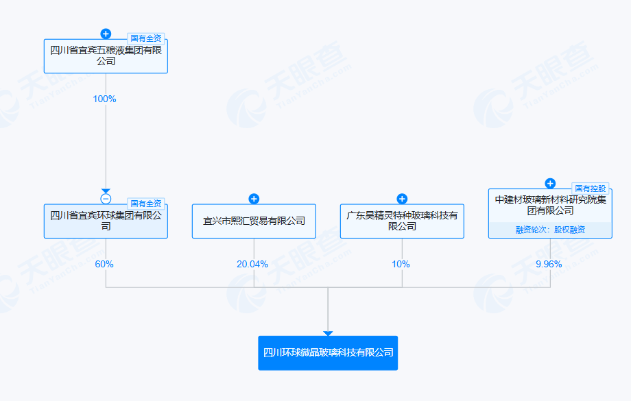天眼查App显示,近日,四川环球微晶玻璃科技有限公司成立,法定代表人为吴建林,注册资本3亿人民币,经营范围包括玻璃制造、日用玻璃制品制造、技术玻璃制品制造、日用玻璃制品销售、技术玻璃制品销售、功能玻璃和新型光学材料销售等。股权全景穿透图显示,该公司由五粮液集团旗下四川省宜宾环球集团有限公司、宜兴市熙汇贸易有限公司、广东昊精灵特种玻璃科技有限公司、中建材玻璃新材料研究院集团有限公司共同持股。