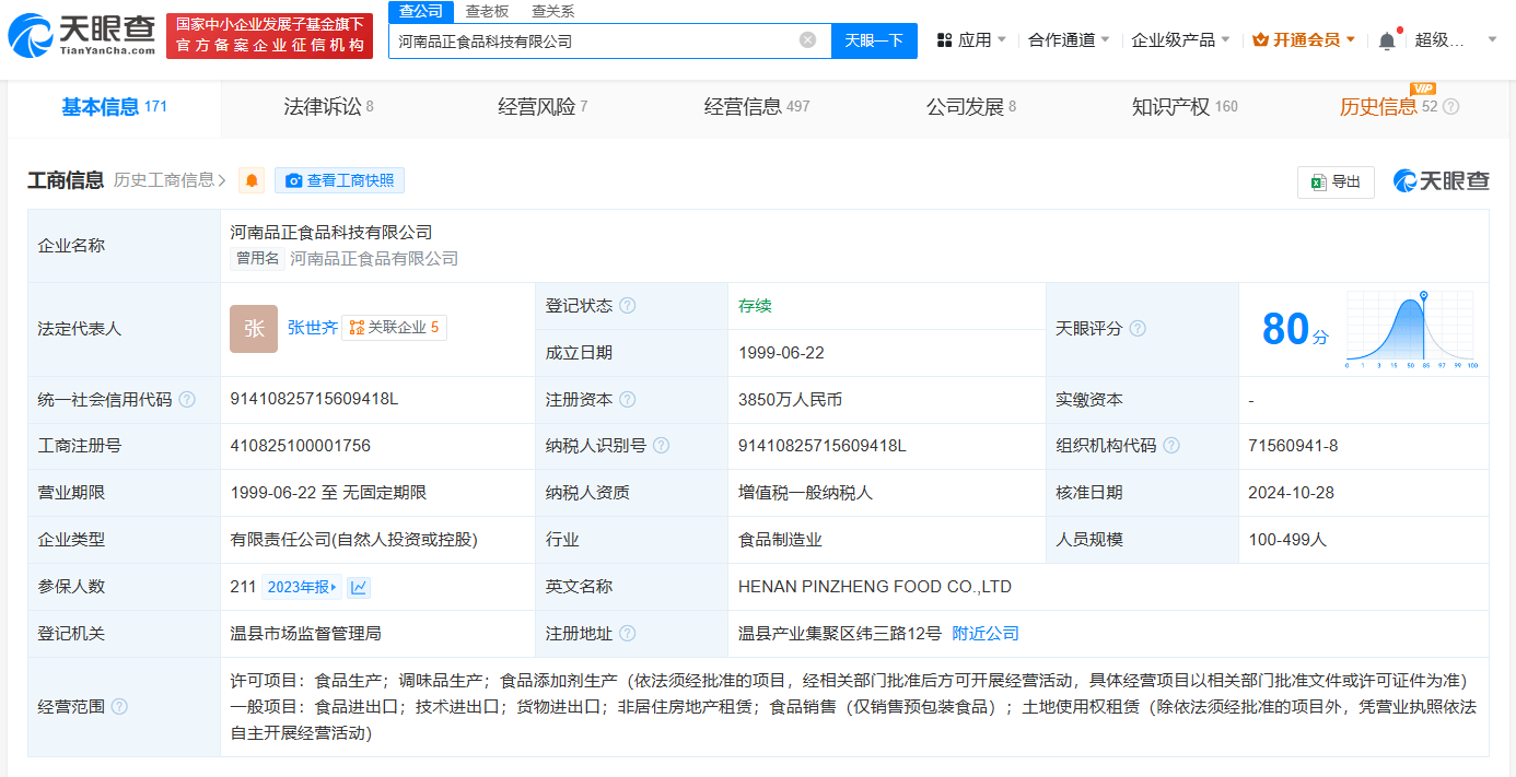 天眼查App显示,安徽燕之坊食品有限公司成立于2001年5月,法定代表人为徐放,注册资本3244.5万人民币,由刘井山等共同持股。对外投资信息显示,该公司持有18家存续企业股份。专利信息显示,该公司拥有数百项专利申请,申请领域涉及加工工艺、设备等领域。此外,河南品正食品科技有限公司成立于1999年6月,法定代表人为张世齐,注册资本3850万人民币,由河南众联优胜企业管理咨询有限公司等共同持股。
