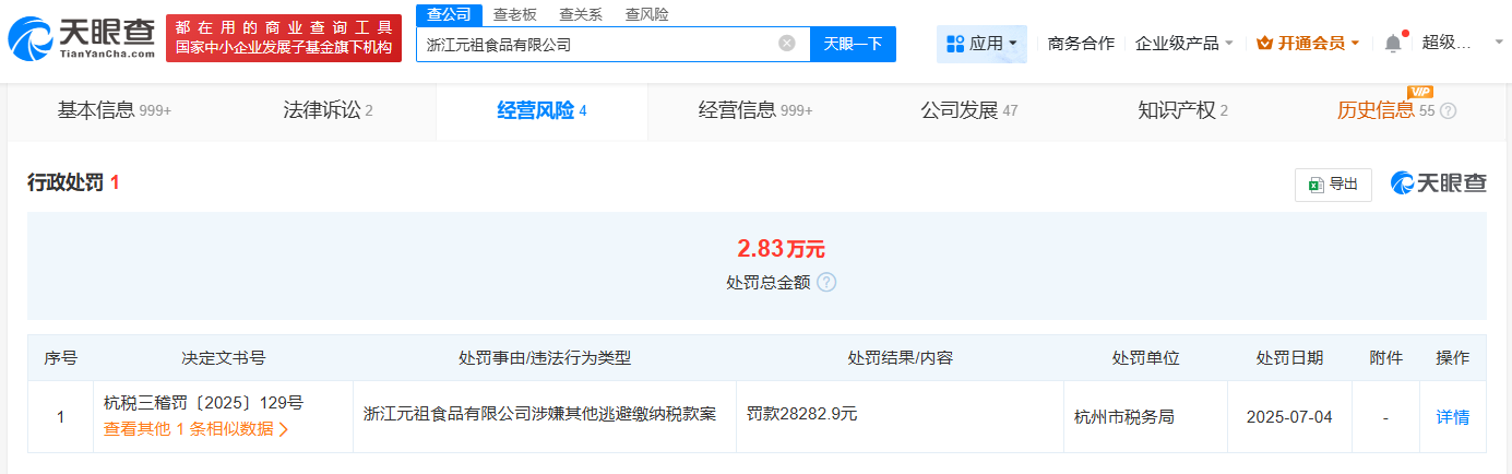 天眼查天眼风险信息显示,近期,浙江元祖食品有限公司因涉嫌其他逃避缴纳税款,被杭州市税务局罚款2.8万余元。