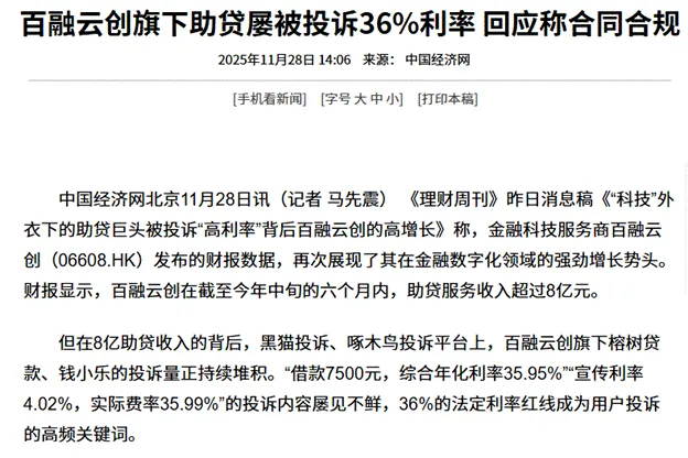 一方面,其“科技赋能”的叙事正遭受用户信任危机的侵蚀。据中国经济网2025年11月底的报道,百融云创旗下或合作的贷款推荐平台,如“榕树贷款、钱小乐”,面临大量用户投诉,问题主要集中在实际综合年化利率接近36%的法定上限、收费项目不透明、以及不知情情况下被扣除会员费等方面。当用户投诉“科技平台”带来的不是更透明的服务,而是更复杂的收费时,其技术创新的光环便在消费者端迅速褪色,品牌声誉遭受直接打击。