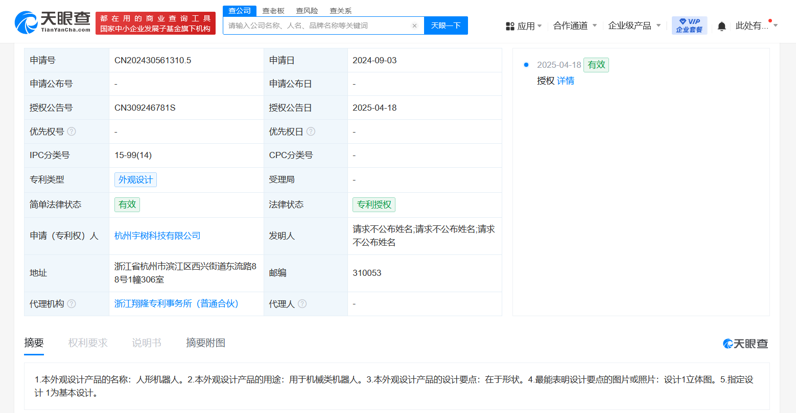 天眼查知识产权信息显示,近日,杭州宇树科技有限公司申请的“人形机器人”外观专利获授权。摘要显示,本外观设计产品的用途为机械类机器人,设计要点在于形状。