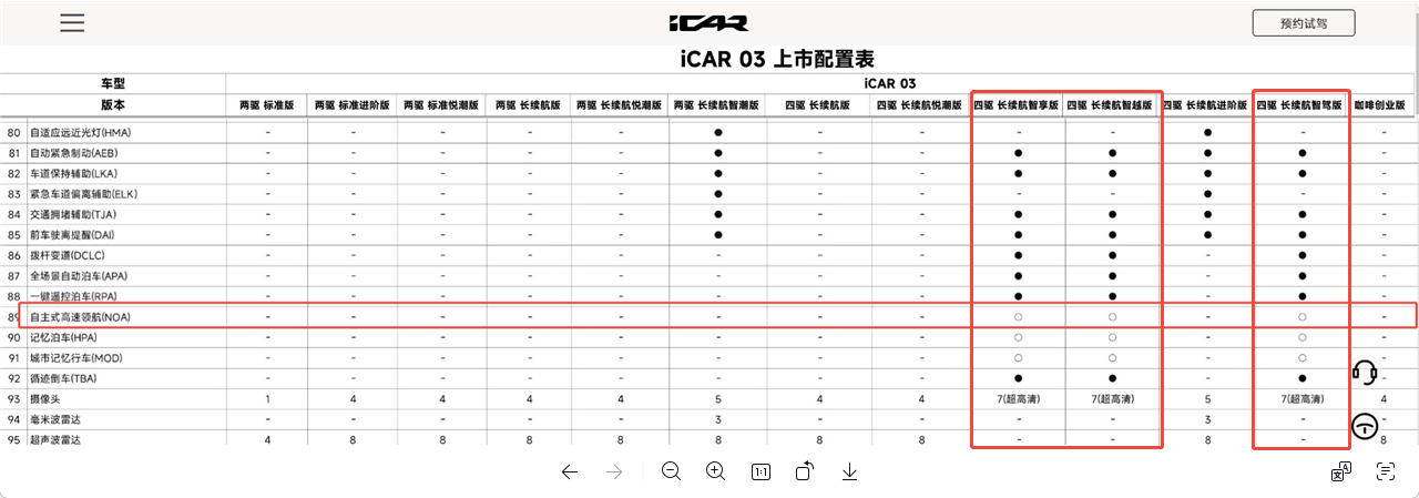 iCAR关于高速领航功能的配置说明,空心圆表示“选配”。图源:奇瑞iCAR官网