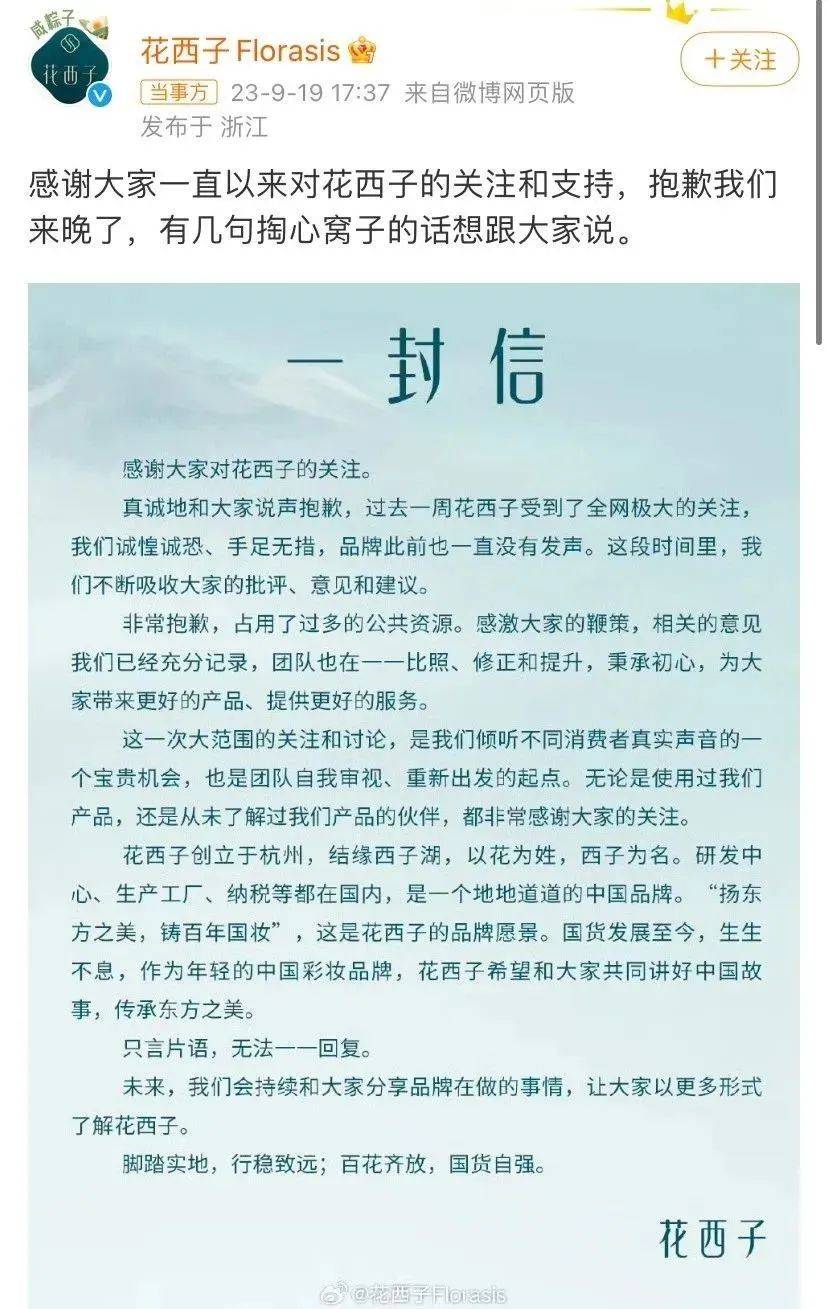 有人将这封信拆开分析,发现这封451字的信共有三个部分:154字抱歉,218字宣传,12+67字套话。对于上述三大疑问,花西子均未予回应。