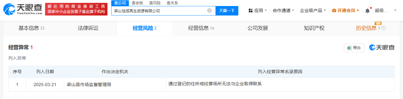 天眼查App显示,近日,梁山佳成再生资源有限公司因通过登记的住所或经营场所无法与企业取得联系,被梁山县市场监督管理局列入经营异常名录。该公司成立于2017年11月,注册资本600万人民币,经营范围包括卫生巾、纸尿裤、床垫的回收、加工及销售。