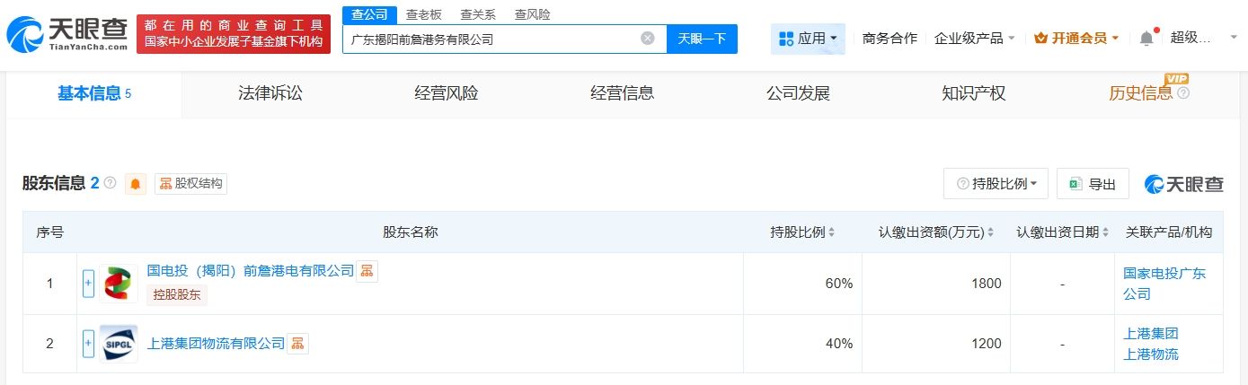天眼查App显示,近日,广东揭阳前詹港务有限公司成立,法定代表人为吕晖,注册资本3000万人民币,经营范围包括港口理货、无船承运业务、船舶港口服务、港口货物装卸搬运活动等。股东信息显示,该公司由国电投(揭阳)前詹港电有限公司、上港集团物流有限公司共同出资。
