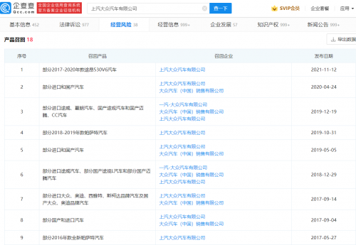 桑塔纳深陷停产传言 企查查显示其公司有多条产品召回信息快讯