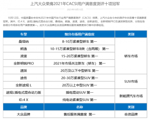 据上汽大众官网显示,10月12日,中国质量协会发布2021年中国汽车行业用户满意度测评(CACSI)结果,上汽大众在今年的测评中共荣膺十项满意度冠军。其中桑塔纳在“8-10万紧凑型轿车”细分市场中用户满意度第一。