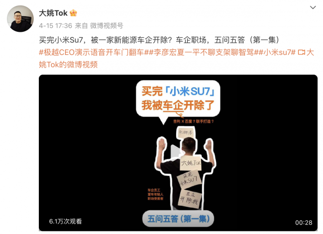 按其表述,“大姚Tok”就职于一家新能源车企,前几天买了小米SU7,5天后就被公司开除了。其表示,公司以违反竞业协议为由将其开除,且未给予其赔偿金。随后,在评论区有网友指出该男子疑似是极越员工。