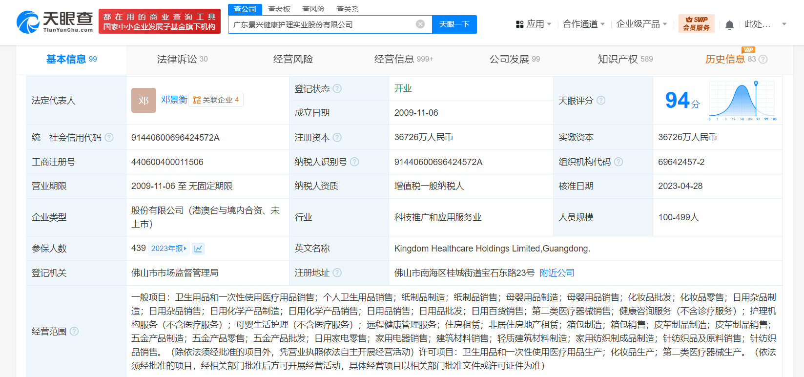 天眼查App显示,ABC关联公司广东景兴健康护理实业股份有限公司成立于2009年11月,法定代表人为邓景衡,注册资本约3.67亿人民币,经营范围含卫生用品和一次性使用医疗用品销售、个人卫生用品销售、母婴用品制造、化妆品批发、日用杂品制造等,由景盛集团控股有限公司、邓锦明、佛山市汇翔投资有限公司等共同持股。知识产权信息显示,该公司拥有40余项“卫生巾”相关专利。值得一提的是,目前,该公司申请的多项专利已被驳回,包括“一种缓解痛经的卫生巾”“一种丝素蛋白美肌卫生湿巾添加液的制备方法及其应用”等。