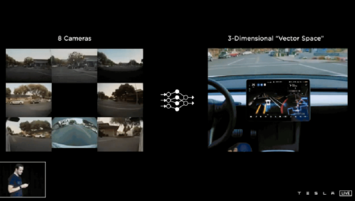 感知的核心任务是识别和理解外部环境。特斯拉的8个摄像头可以不停地采集到外部世界的2D图像,也就是平面图像,但这不足以构造出我们人类驾驶所需要的始终延续的车道线、疾驰而过的车辆等信息。通过感知神经网路,特斯拉构建出一个表征真实世界的3D向量空间。