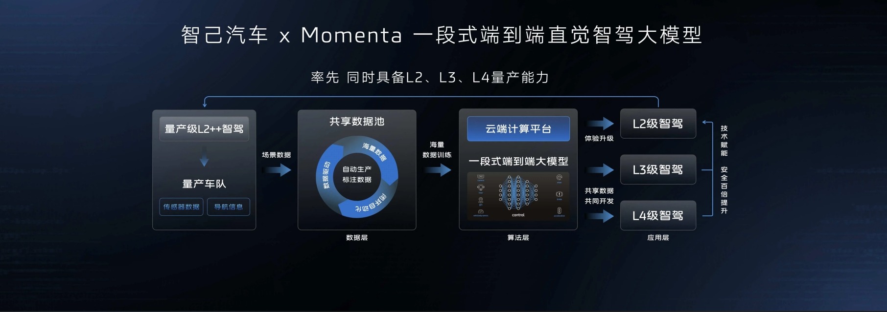 以数据驱动推动AI算法进化,通过量产辅助驾驶和L4自动驾驶两大支点的协同进化,让“辅助驾驶”和“自动驾驶”的技术边界线完全被打破。