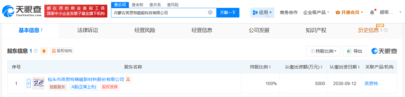 天眼查App显示,近日,内蒙古英思特磁能科技有限公司成立,法定代表人为范立忠,注册资本5000万人民币,经营范围包括磁性材料生产、磁性材料销售、稀土功能材料销售等。