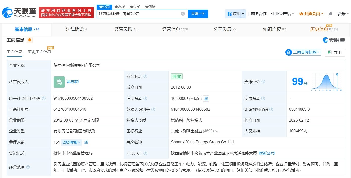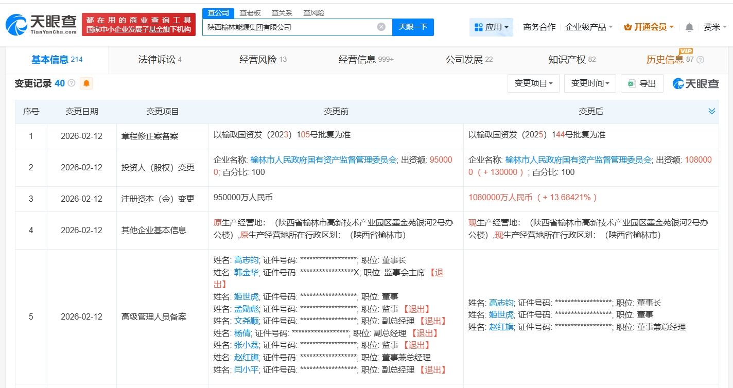 天眼查App显示,近日,陕西榆林能源集团有限公司发生工商变更,注册资本由95亿人民币增至108亿人民币,增幅约14%。