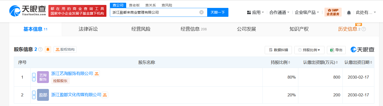 天眼查显示,胖都来关联公司浙江盈都来商业管理有限公司成立于今年2月,法定代表人为都建明,注册资本1000万人民币,由浙江艺淘服饰有限公司、浙江盈都文化传媒有限公司分别持股80%、20%。