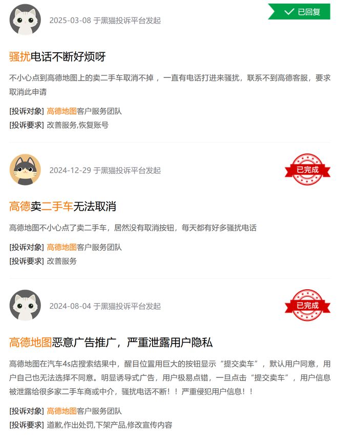 相关投诉还包括消费者的隐私权未获充分保护。中国交通广播报道,广东的李先生和开封的刘先生在未使用打车服务的情况下,被平台私自扣费。黑猫投诉平台显示,多位消费者称使用高德导航时误点“我要卖车”选项,无法撤销,30分钟后即收到大量二手车骚扰电话,且无法撤回手机号信息。