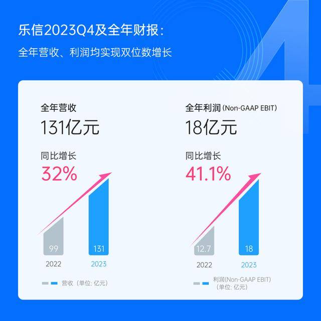 北京时间3月21日,中国领先的新消费数字科技服务商乐信(NASDAQ:LX)发布2023年四季度及全年未经审计财务业绩。在当前宏观经济环境和行业环境下,乐信坚持风险和数据双轮驱动,审慎经营,实现稳健发展:四季度营收35亿元,同比增长15.1%;全年营收131亿元,同比增长32%;全年利润(Non-GAAP EBIT)18亿元,同比增长41.1%。2023年全年营收、利润均实现双位数增长。