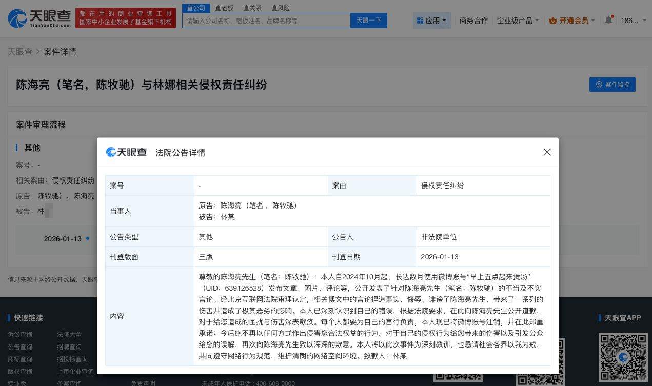 天眼查天眼风险信息显示,1月13日,法院刊登林某向陈海亮(陈牧驰)致歉的声明。公告显示,其使用微博账号公开发表了针对陈海亮先生(陈牧驰)的不当及不实言论。经北京互联网法院审理认定,相关博文中的言论捏造事实,侮辱、诽谤了陈海亮先生,带来了一系列的伤害并造成了极其恶劣的影响。其已深刻认识到自己的错误,向陈海亮先生公开道歉,并已将微博账号注销。