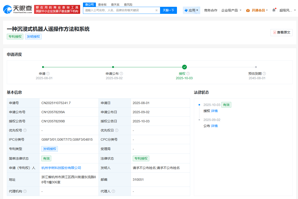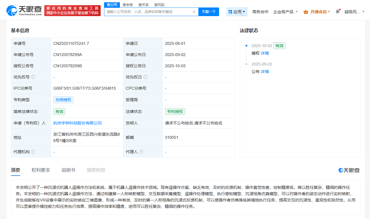 天眼查App显示,近日,杭州宇树科技股份有限公司申请的“一种沉浸式机器人遥操作方法和系统”专利获授权。
