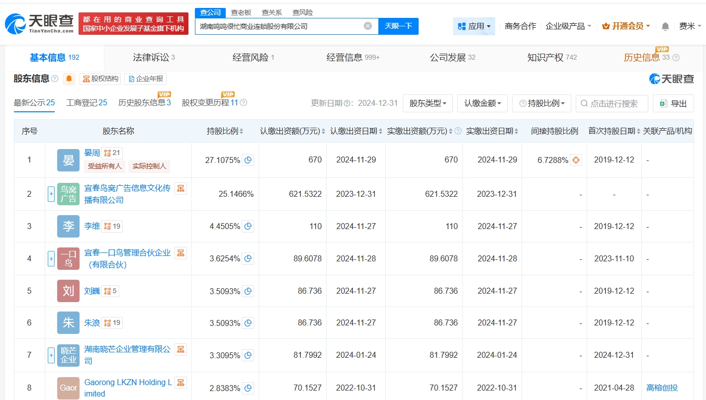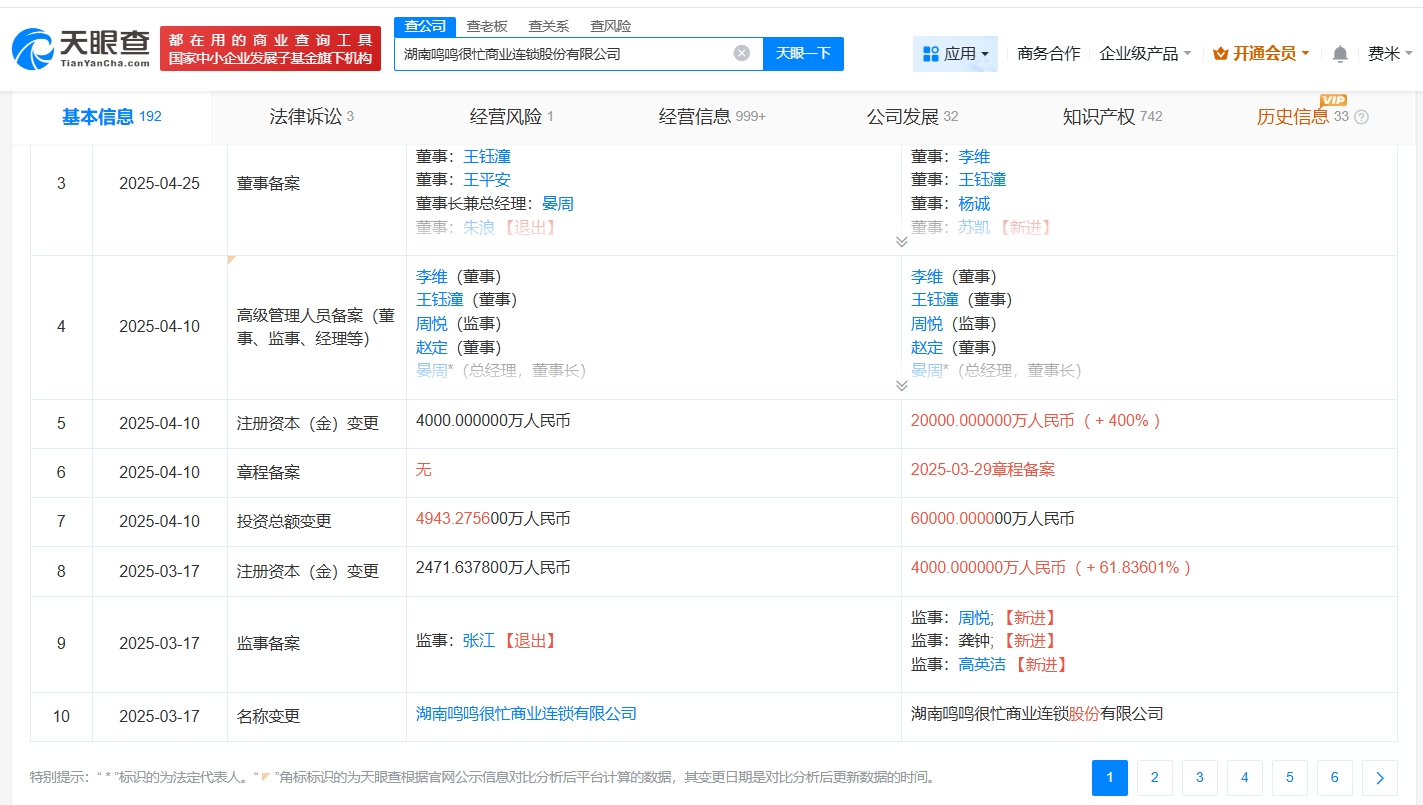 天眼查App显示,鸣鸣很忙关联公司湖南鸣鸣很忙商业连锁股份有限公司成立于2019年12月,法定代表人为晏周,经营范围包括食品销售、食品互联网销售、酒类经营等,由晏周、宜春鸟窝广告信息文化传播有限公司、李维等共同持股。变更记录显示,去年该公司发生两次增资,注册资本由约2472万人民币增至2亿人民币,此外企业名称由湖南鸣鸣很忙商业连锁有限公司变更为湖南鸣鸣很忙商业连锁股份有限公司,对外投资信息显示,该公司对外投资30余家企业,其中20余家处于存续状态。值得一提的是,2025年以来,该公司已成立杭州鸣忙供应链有限公司、西安鸣忙供应链有限公司等多家新公司。