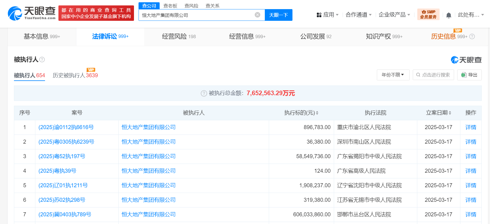 天眼查法律诉讼信息显示,3月17日,恒大地产集团有限公司新增7条被执行人信息,执行标的合计6.6亿余元,涉及金融借款合同纠纷、票据纠纷等案件,部分案件被执行人还包括恒大地产集团石家庄有限公司、恒大集团有限公司等,执行法院为邯郸市丛台区人民法院、广东省揭阳市中级人民法院等。