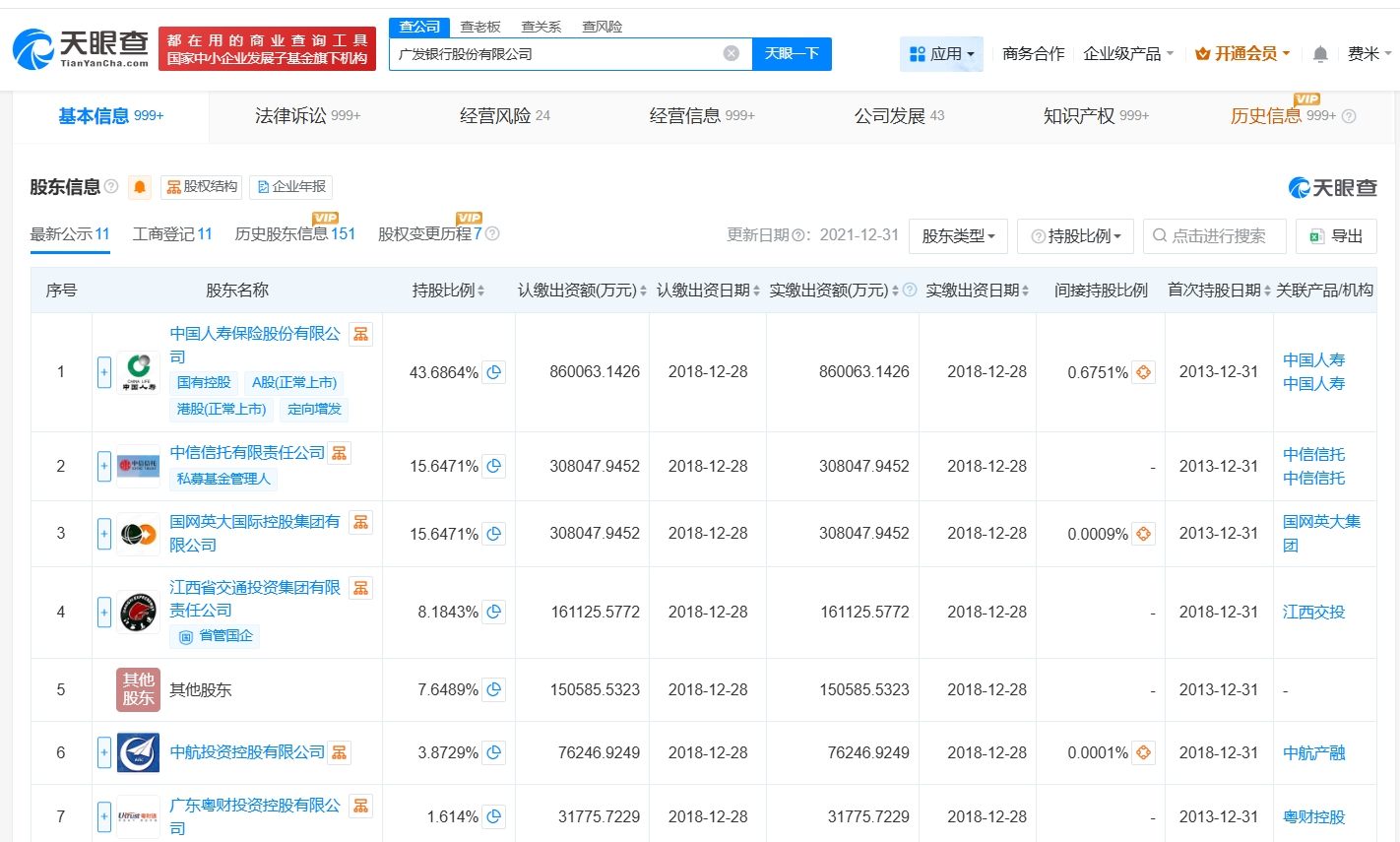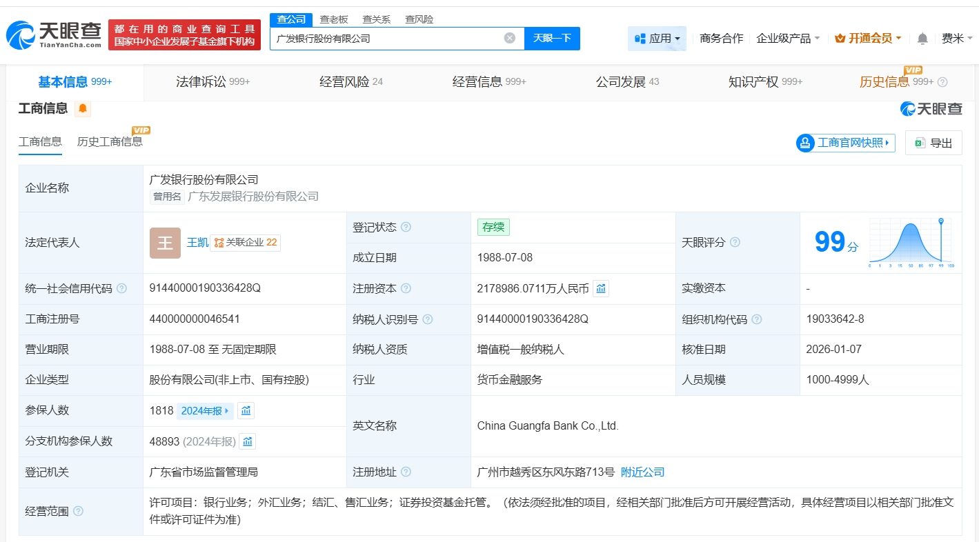 广发银行股份有限公司成立于1988年7月,法定代表人为王凯,注册资本约217.9亿人民币,经营范围包括银行业务、外汇业务、证券投资基金托管等。股东信息显示,该公司由中国人寿(601628)、中信信托有限责任公司、国网英大国际控股集团有限公司等共同持股。