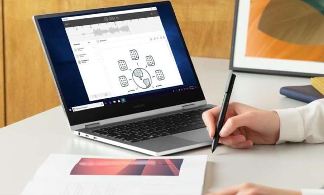 三星星曜 Pen 能够 360 度翻转,可以在平板、笔记本之间可以自由切换,不管是立着、倒着、折叠,每一种姿态都随心自如。这意味着,当你在登机或是等电梯的空隙,都可以不慌不忙地将笔记本翻转 360 度,瞬间化身平板模式,一手轻巧地托着笔记本,一手握着 A Pen。