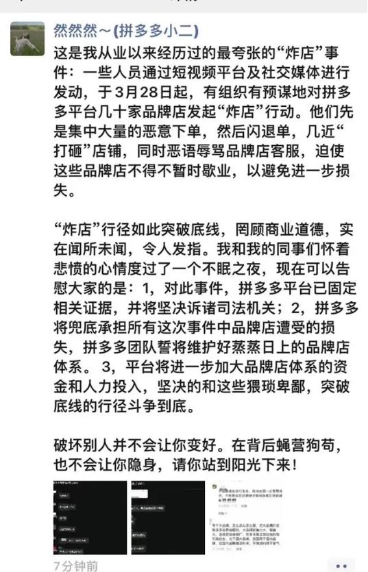 在媒体引用的拼多多小二发布的朋友圈中,拼多多小二斥责此 " 炸店 " 行径 " 突破底线,罔顾商业道德,闻所未闻。"