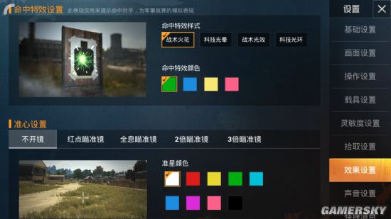 除此之外,官方还展示了游戏中的命中特效,根据介绍《和平精英》游戏中提供可根据个人喜好设置命中特效的功能。选手可在设置系统-效果设置页签中,选择4种命中特效样式组合4种命中特效颜色共计16种的搭配,选手还可以在训练场中打靶体验所选择的命中特效。