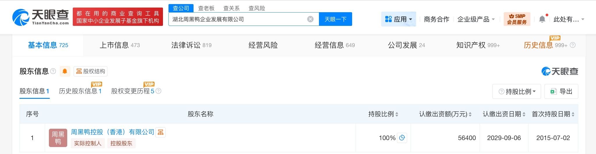 天眼查App显示,近日,湖北周黑鸭企业发展有限公司发生工商变更,注册资本由3.64亿增至5.64亿,增幅约55%。