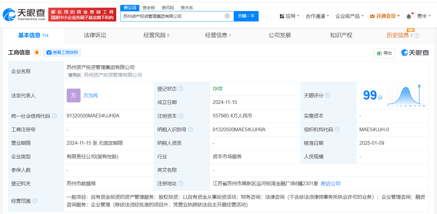 苏州资产投资管理集团有限公司成立于去年11月,法定代表人为万为民,经营范围含自有资金投资的资产管理服务、股权投资、以自有资金从事投资活动等,现由苏州国际发展集团有限公司及上述新增股东共同持股。