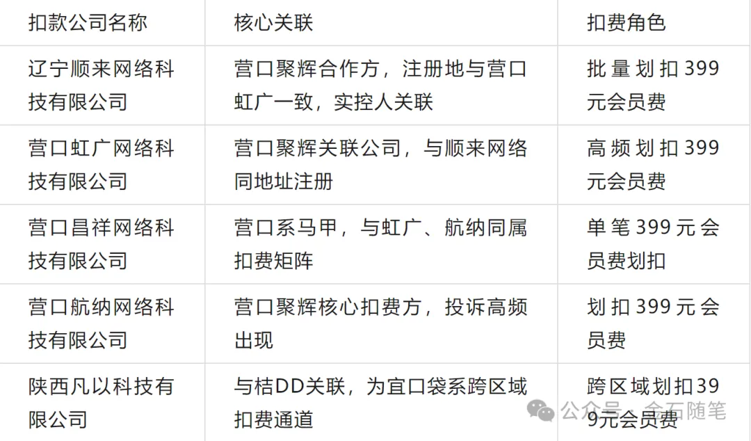 有媒体曾统计过,营口聚辉网络科技有限公司通过多个扣款马甲公司,分散投诉风险,实则都是为扣费而生,规避集中投诉风险而生的。