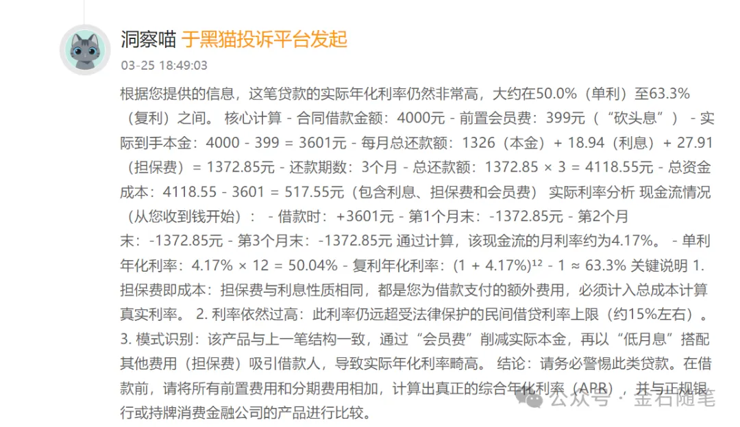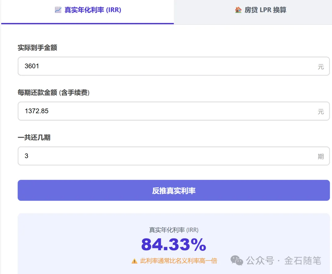 据金石随笔计算,如果按4000眼本金计算,利率只有17.7%;但如果按实际到款3601元计算,这笔贷款的真实利率高达84.33%,属于变相高利贷。